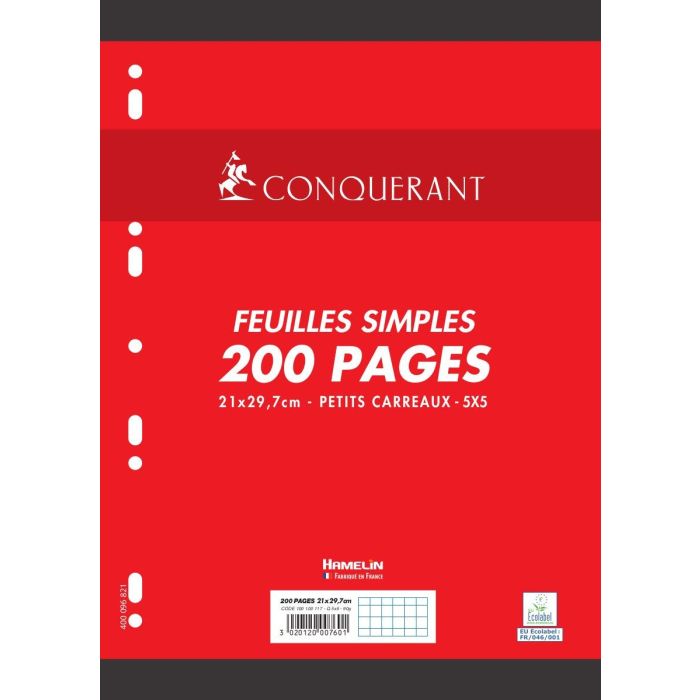 Feuilles simples blanches perforées, 210 x 297 mm, à petits carreaux pour le collège et le lycée en lot de 100 CONQUERANT. Fiche n° 100103536