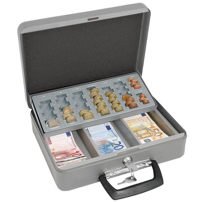 Caisse portable avec monnayeur pour pièces et billets en tôle acier laquée gris 30 x 24 cm de WEDO. Fiche n° 149658012