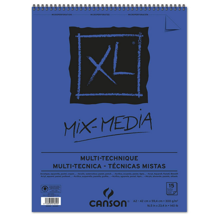 Bloc Canson XL MIX MEDIA de 15 feuilles A2 pour dessin adapté aux techniques pures ou mixtes à base d'aquarelle, gouache, acrylique. Fiche n° C200001859