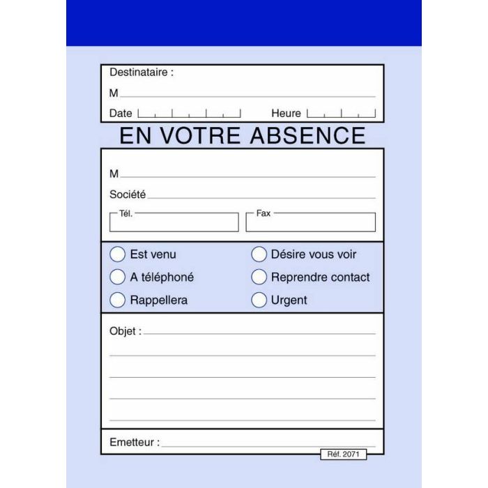 Bloc-Notes pour les Messages : En votre absence. Facilite la saisie des informations à transmettre. Fiche n° 2071