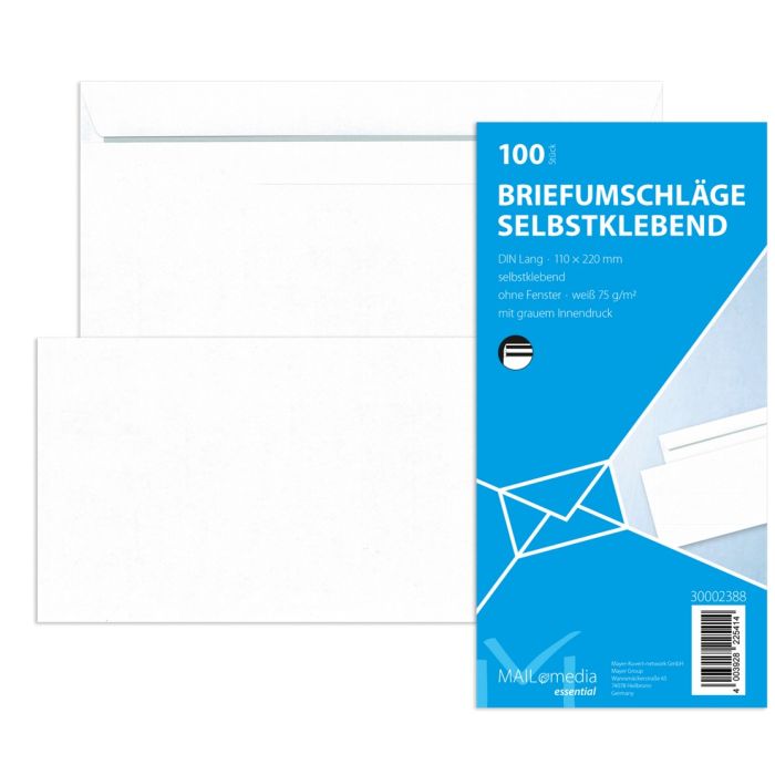 Enveloppes 110 x 220 mm à fermeture auto-adhésive sans fenêtre MAIL MEDIA pour le courrier. Paquet de 100. Fiche n° 30002388