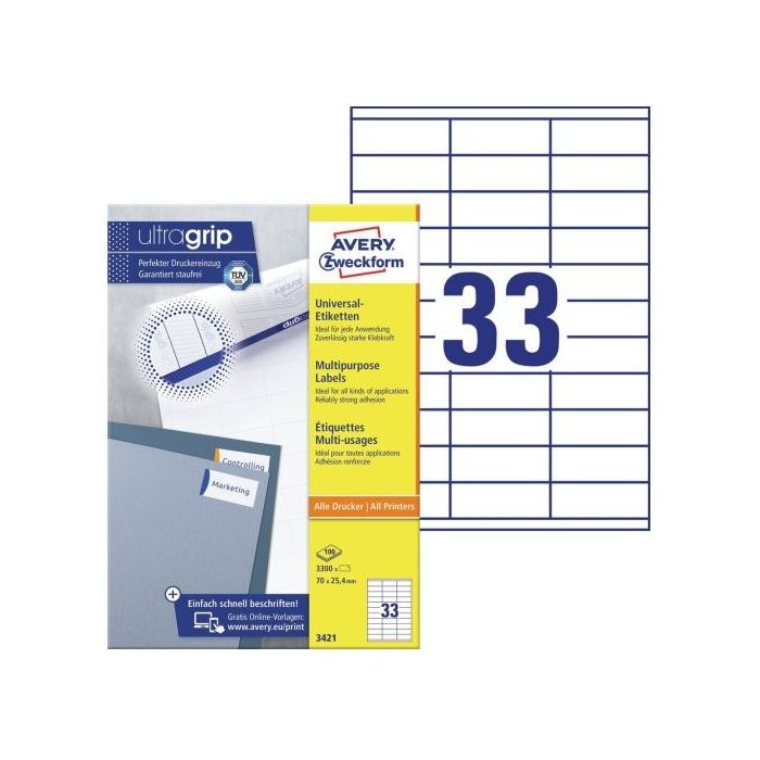 Étiquettes adhésives écologiques 70 x 25,4 mm pour un marquage de qualité AVERY. Fiche n° 3421