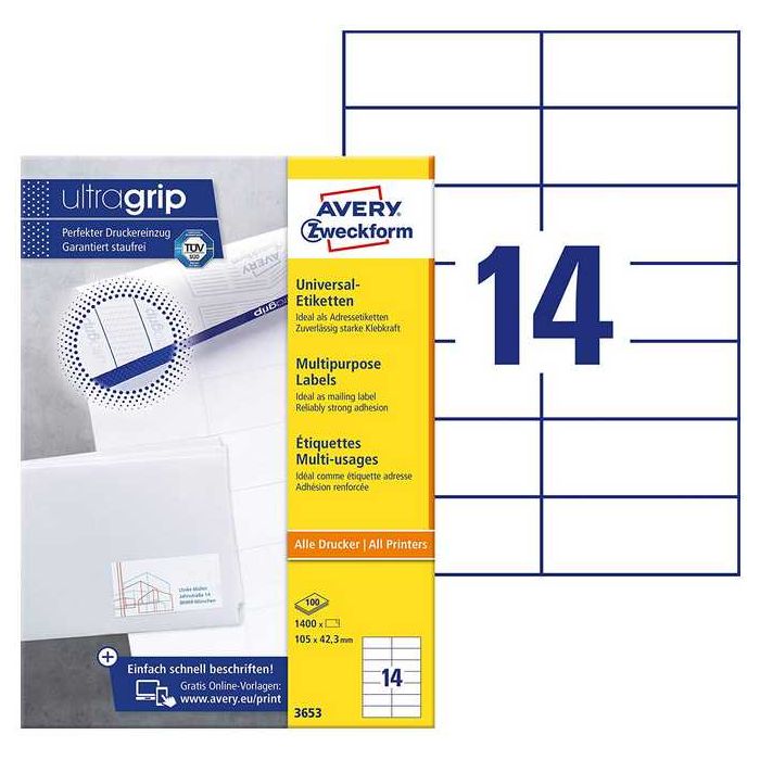 Étiquettes autocollantes 105 x 42,3 mm Ecologique d'Avery pour Enveloppes, étiquetage et marquage de produits. Fiche n° 3653