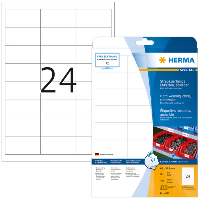 Étiquettes 66 x 33,8 mm en plastique, ultra-adhérent, résistant aux intempéries HERMA. Fiche n° 4573