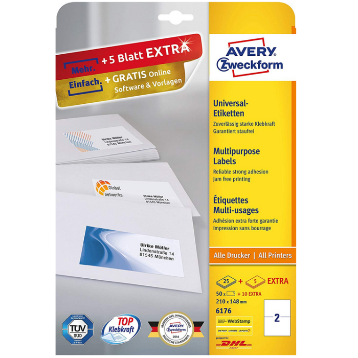 Étiquettes autocollantes A d'AVERY pour Adresse et Marquage de produit. Adhésion permanente. Fiche n° 6176