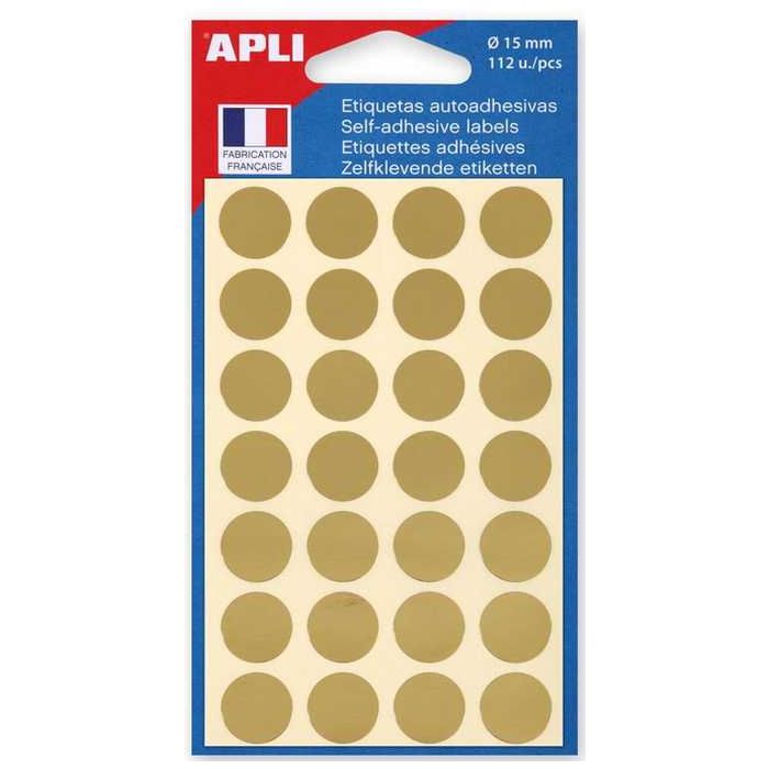 Paquet de 112 pastilles autocollantes 15 mm de couleur dorée d'APLI. Fiche n° 100602