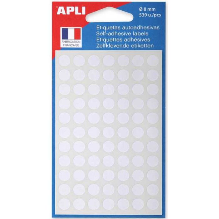 Petites gommettes adhésives APLI blanches de 8 mm : Praticité et visibilité garantie. Fiche n° 111830