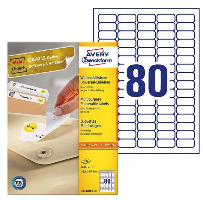 Planche de petites étiquettes adhésives repositionnables 35,6 x 16,9 mm d'AVERY pour marquer et identifier les objets et produits. Grand paquet. Fiche n° L4732REV-100