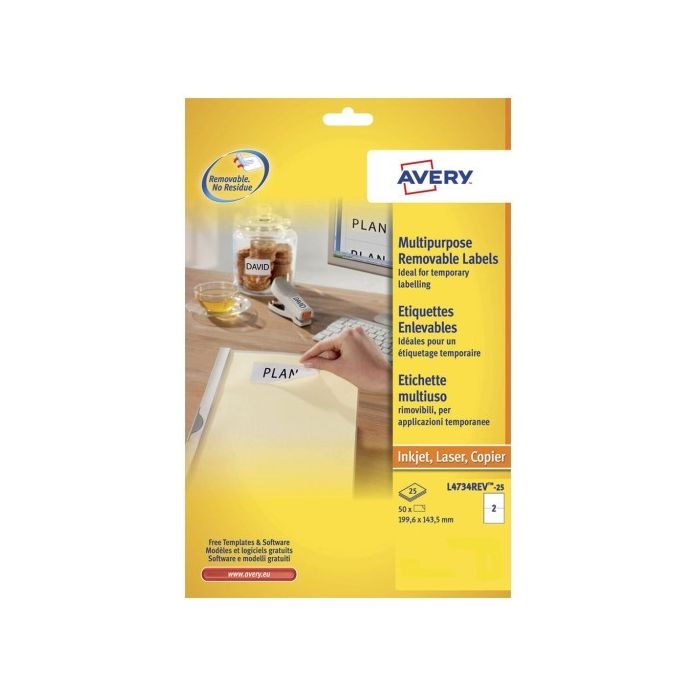 Planche d'étiquettes adhésives 199,6 x 143,5 mm repositionnables écologiques d'AVERY pour marquer, étiqueter et identifier les objets et produits. Fiche n° L4734REV-25 E