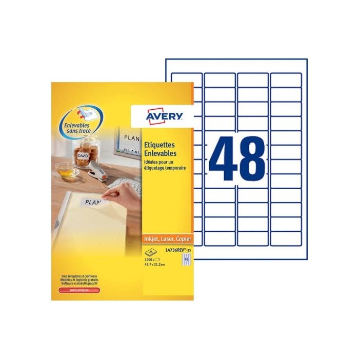 Planche d'étiquettes adhésives repositionnables 45,7 x 21,2 mm d'AVERY pour marquer, signaler et identifier les objets et produits. Grand Paquet. Fiche n° L4736REV-25