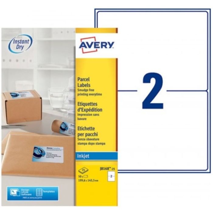 Étiquettes d'expédition autocollantes blanches 199,6 x 143,5 mm AVERY pour imprimante jet d'encre.. Fiche n° J8168-25FR