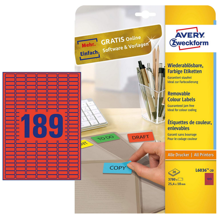 Mini-étiquettes AVERY pour copieurs, imprimantes jet d'encre et laser. Fiche n° L6036-20