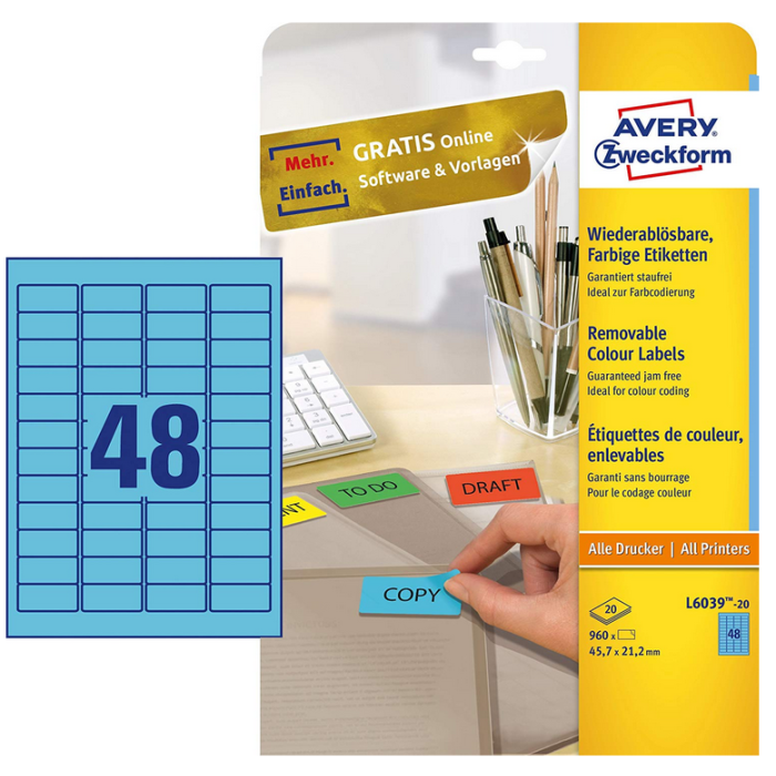 Mini-étiquettes AVERY pour copieurs, imprimantes jet d'encre et laser. Fiche n° L6039-20