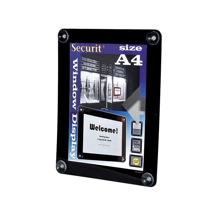 Porte-Affiches à contour noir avec ventouses pour documents A4 - 210 x 297 mm de SECURIT. Fiche n° PFW-A4-BL